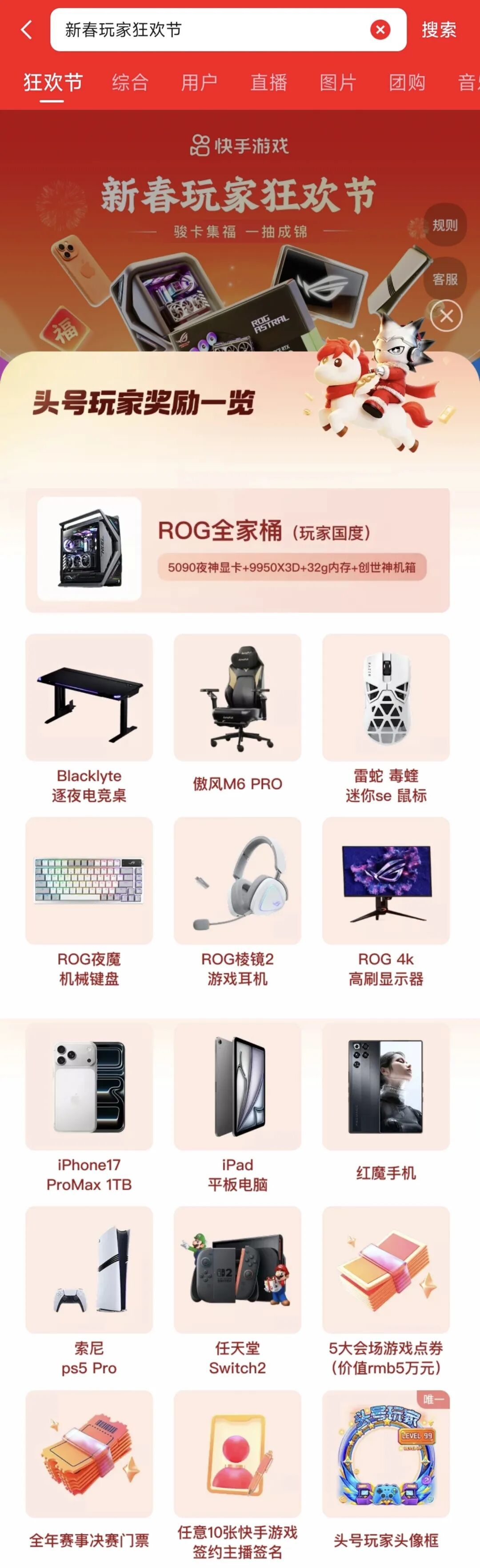 这还不算完,快手直接把KPL、PEL等全年赛事活动的直通权益、电竞选手和主播的互动权益也塞了进去——中了这个奖,相当于一整年的游戏排面都被快手承包了。