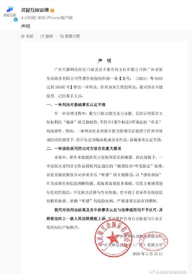 26年2月15日凌晨,《代号鸢》官方发布动态,对此作出回应,表示对判决结果不认可,将向上一级法院提起上诉。