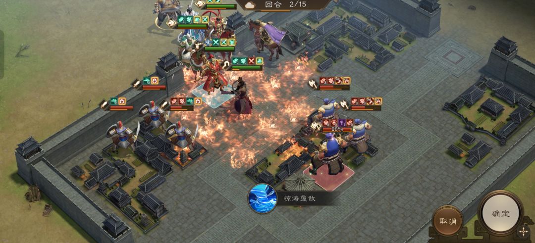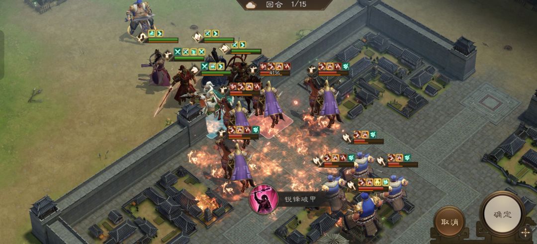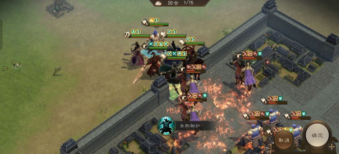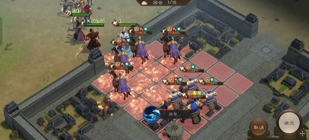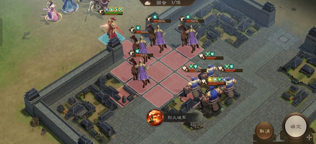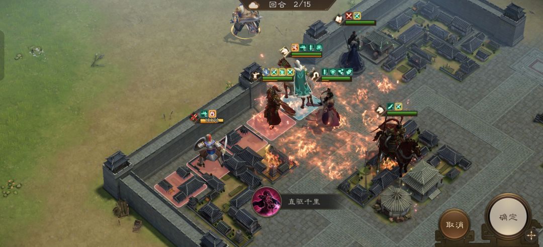 回合开始周瑜移动到上图位置开技能烈火破军攻击敌人。