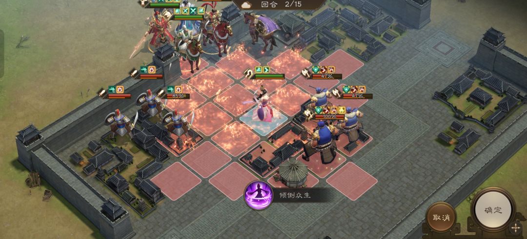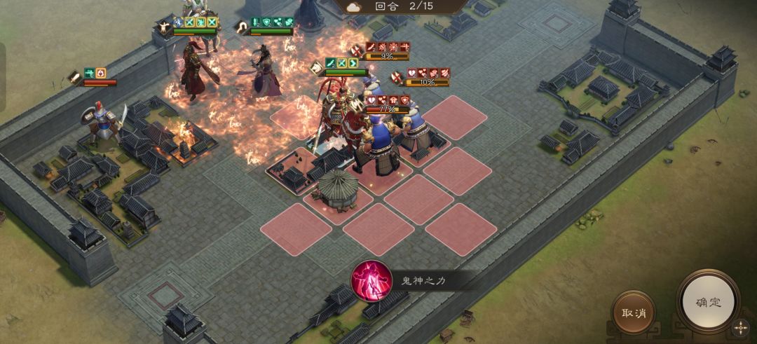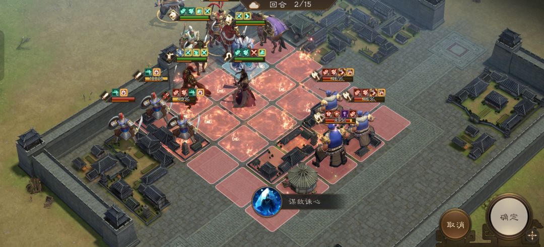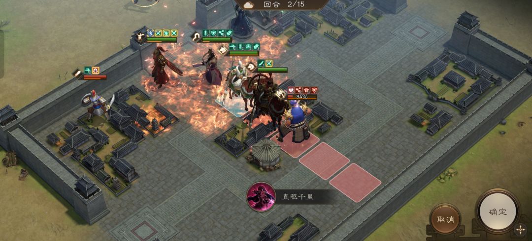 第二回合,貂蝉前进到上图位置开怒技为敌人上减益,再动后退一步开技能魅惑boss许褚。