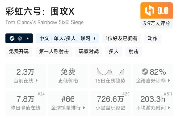 比如说,在2018年,《彩虹六号:围攻》国区玩家的活跃数就超越了美区,达到了414500人,占比21.05%(Steamspy数据);再比如说,游戏曾多次进入Steam国区销量TOP5,如今小黑盒玩家数也已来到了726万人。