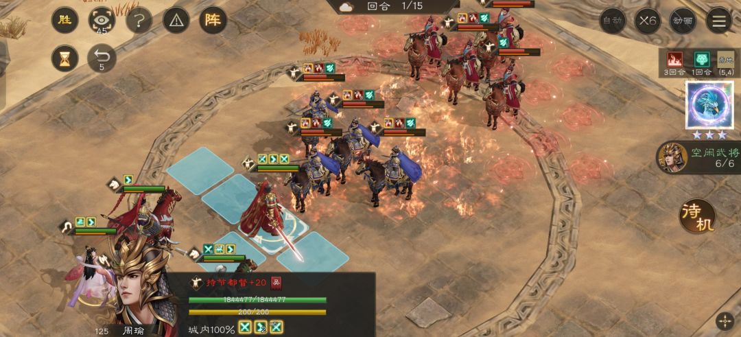 回合开始周瑜前进到上图位置开技能烈火破军攻击敌人。