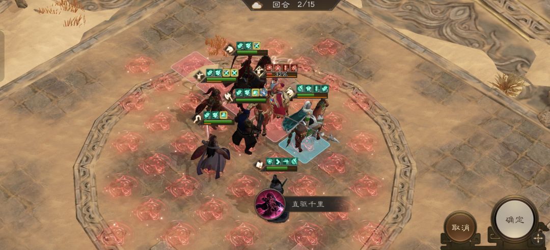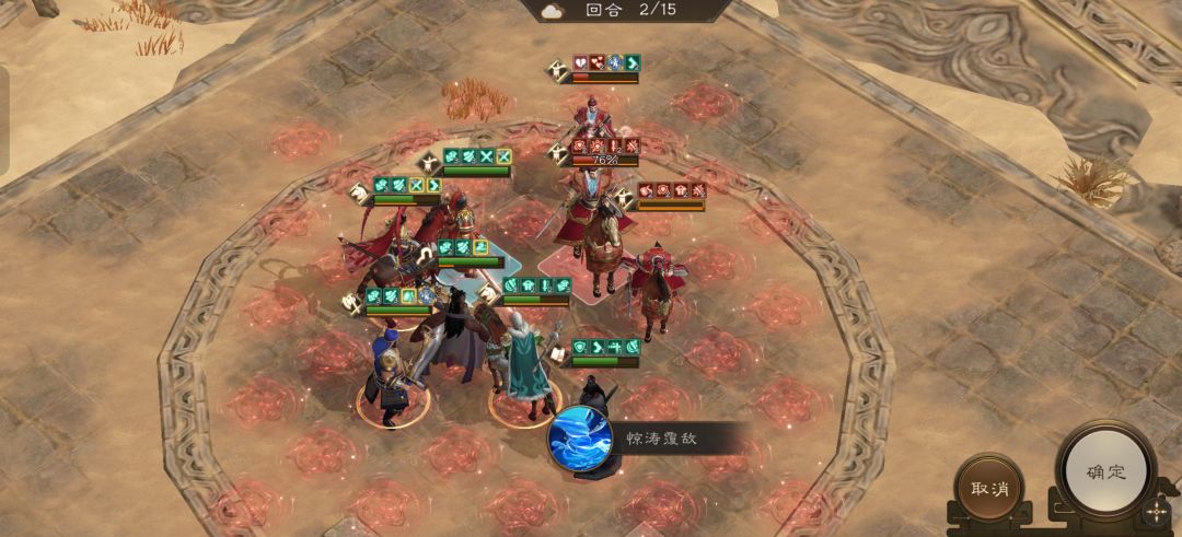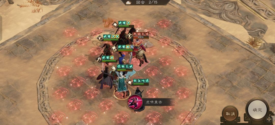 吕布前进到上图位置开技能无双乱舞攻击敌人,马超移动到上图位置开技能斩杀前排曹操。敌军回合后剩余两个曹操也被斩杀。