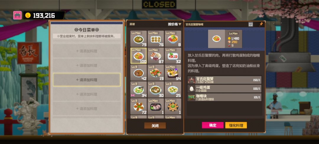如果你非常懒不想下水可以做这几个,只需要去鱼塘就可以解决所有菜,绯红鱼卷直接给分店不用给食材非常方便可以直接毕业,我们主店就做剩下的这些只需要派遣的食材,醋拌普塔虾因为要下海拿黑角珊瑚太麻烦了直接踢出去了