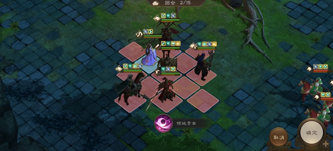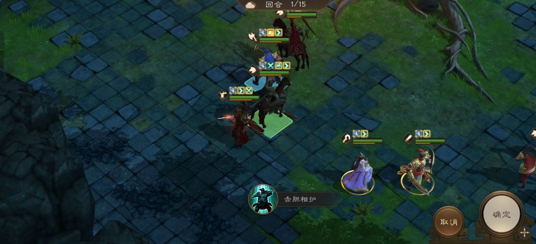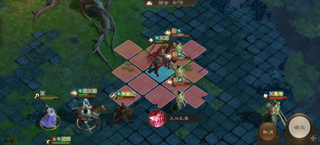 第一回合吕布、马超、周瑜向后移动到上图位置,许褚移动到上图位置开辅助为马超加增益。