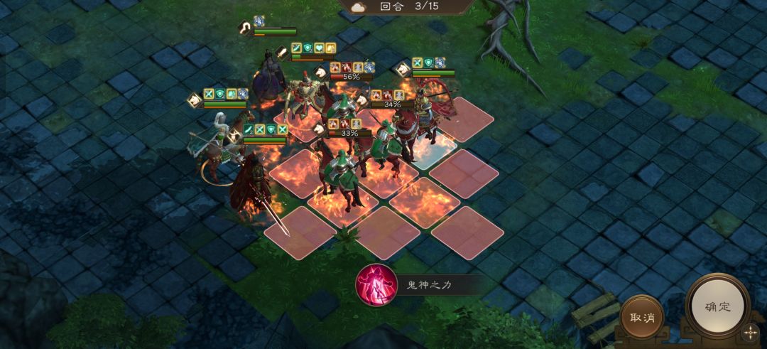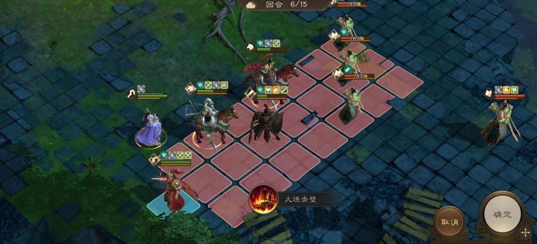 第三回合三个敌方关羽被引过来,周瑜移动到上图位置开技能烈火破军攻击三个关羽。