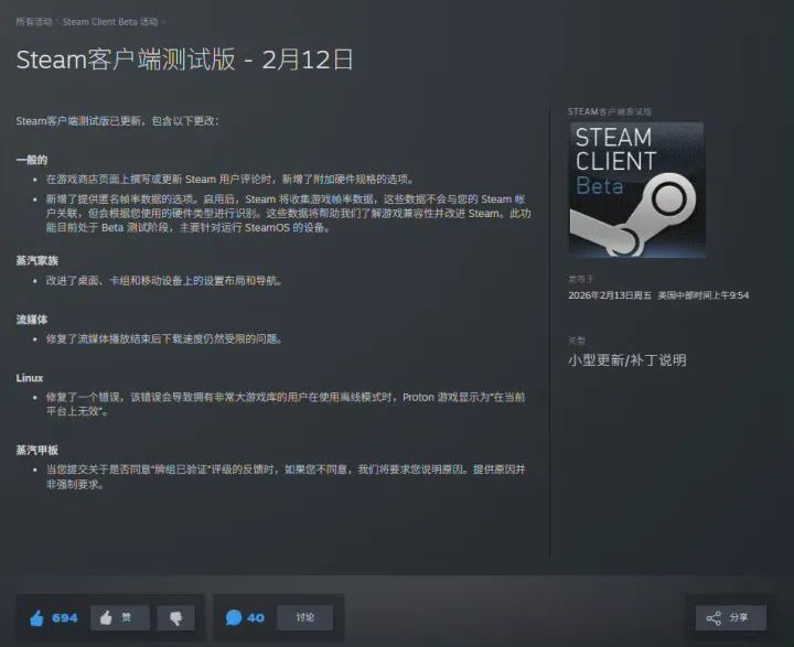 Steam客户端测试版更新上线 游戏评论可自选显示PC硬件配置