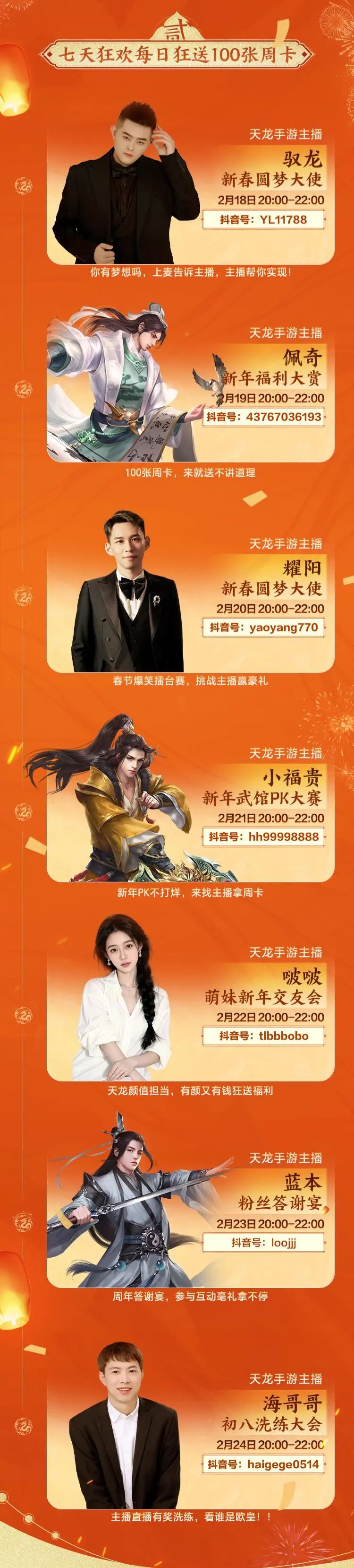 无需复杂操作,解锁福利超简单!各位少侠,想要抱走这些马年专属江湖福利,只需锁定以下指定主播的直播间,每晚两小时,全程守候、积极互动,就有机会斩获周卡及各类惊喜好礼!