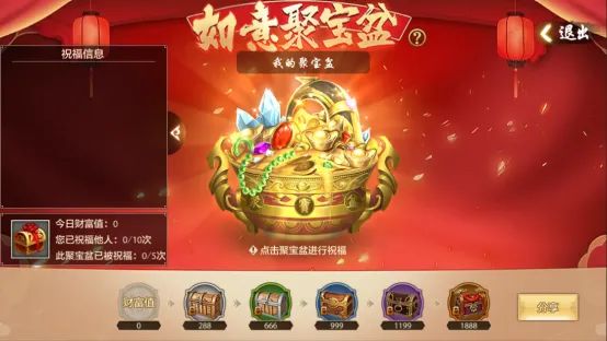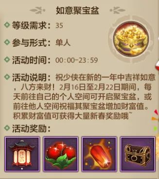 2月16日至2月22日活动期间,各位少侠每天都可以前往自己的个人空间,开启聚宝盆接受财运祝福,也可以前往他人的空间给其聚宝盆增加财富值。