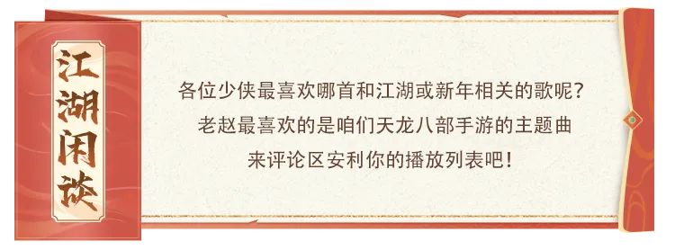 而今年,咱们天龙八部的除夕C位,那必然还是各位少侠啦!老赵已经给大伙儿攒好了局,搭好了咱们天龙的专属春晚舞台,就等你上线狂欢啦!今年直接安排了走心又走量的新春活动,把新年狂欢焊死在江湖里,天龙豪杰亲自登台,带你回忆江湖里的温暖与热血。