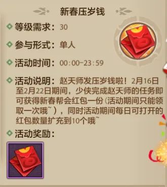 不知道各位少侠过年能领到多少压岁钱呢?老赵也给大伙准备了一份好礼哦!2月16日至2月22日期间,各位少侠只要找到老赵,给我老赵拜个年,就能拿到一份大大的新春帮会压岁钱红包!