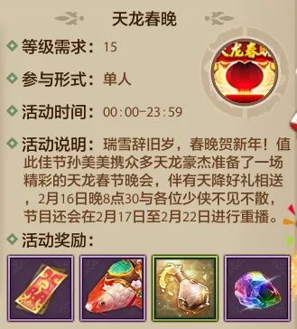一边看节目,一边领礼物,咱们天龙春晚就是这么惬意!2月16日晚8点30,老赵在会场等你,不见不散!错过的少侠也不用着急,2月17日至2月22日将会对节目进行重播,不落下每一份精彩!