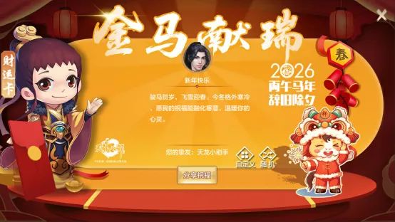 无论是给侠侣写的甜言蜜语,还是给兄弟写“来年继续并肩”,一份简单的祝福,从来都不止是文字,更是你和搭子们,穿越江湖风雨、一路相伴的满满情义。不用千言万语,寥寥数语,便足以诉说牵挂与期许,这便是天龙人独有的,温柔又有力量的情谊。