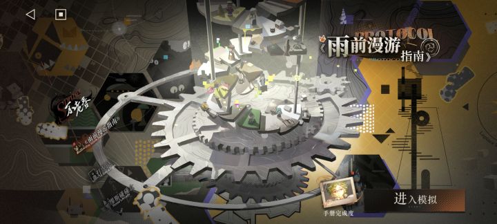 进入雨前漫游指南活动页面,进入模拟:开始模拟-下一步-选择-开始模拟-左上角退出-右下角漏斗-确认放弃-结算获得手册完成度