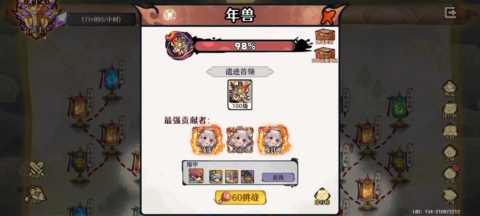 神兵主带擎天,其他看个人怒气选择,可以带绝情,炎芒,祝融等补怒气即可。