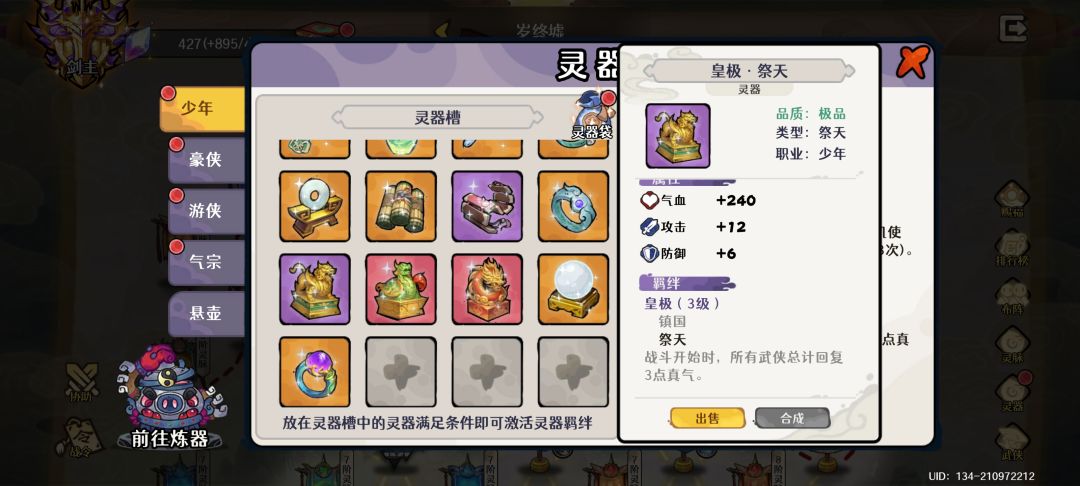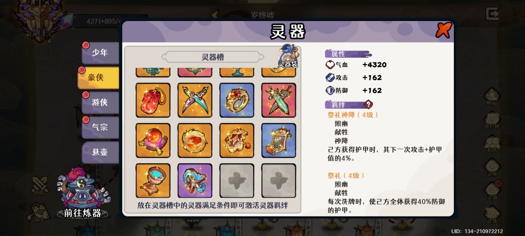 注意:灵器组合套装(如上图祭礼神降)需要3件灵器至少一个绝品或者神品的级别(黄色或者红色),才可以激活组合套装效果。