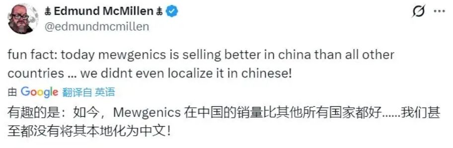《以撒的结合》制作人E胖近日发文透露,旗下新作《喵喵的结合》即便未推出官方中文,中国区销量仍超越所有国家,成为全球第一大市场,足见中国玩家的热情。