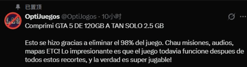 国外知名游戏博主OptiGames擅长用低配硬件挑战现代大作,此前曾将《GTA5》从120GB压缩到9.60GB,引发玩家热议。但近日他再度突破极限,成功把游戏体积压缩至2.5GB,压缩比例高达98%。