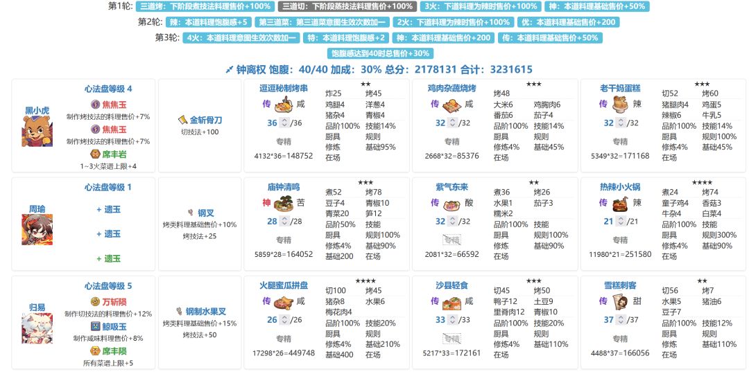 1. 整体配置思路两种。第一种:前两轮上【1-2火】菜拿分,第三轮上【3-5】火菜+低火厨师压品级。 2. 第二种:前两轮如果不可避免引入【3-5火】菜拿分,则第三轮上【1-2火】且符合【第一轮降饱食度意图的技法】的菜+相关技法低的厨师控品级。