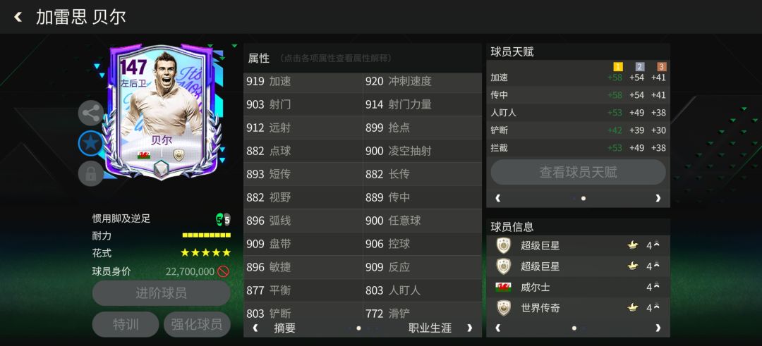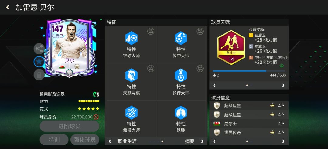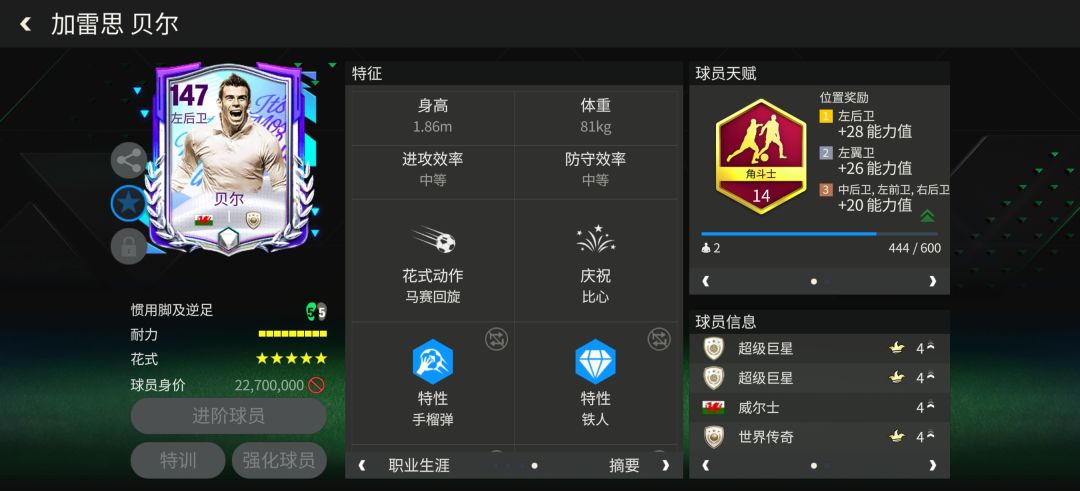 特性方面,贝尔配备了手榴弹、铁人、铲球大师、传中大师、天赋异禀、长传大师、盘带大师、铁肺八项特性,这对他的传球助攻能力有进一步提升。#fc足球世界