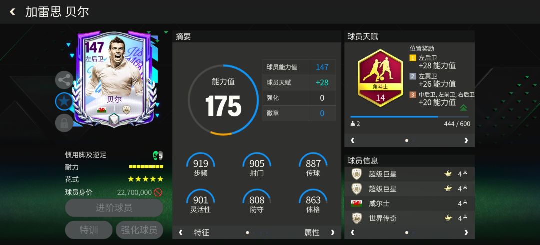 天赋方面,贝尔配备了边后卫最热门的天赋角斗士,显著提升了他的加速、传中、人盯人、铲断、拦截五项数据。这让贝尔的速度优势以及一对一防守稳定性都有一定增强。其他数据中,贝尔的冲刺速度、射门力量、远射、盘带、控球等进攻端关键数据都保持在900以上的数值,彰显了他的进攻型边后卫本色。