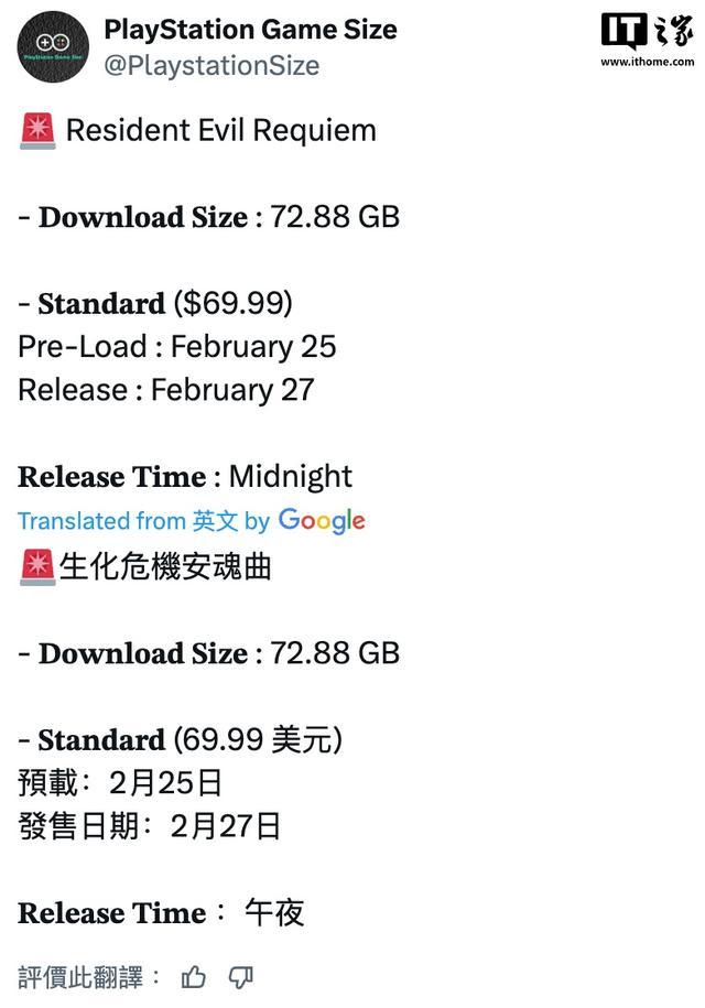 PlayStationGame Size 媒体昨天在推特平台发文,曝光卡普空《生化危机:安魂曲》游戏 PS5 版的文件大小。