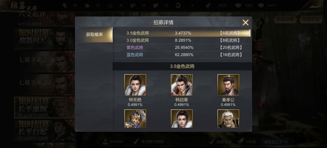 现在廉颇6星,其中,聚宝盆1个,举将2个,西瓜1个,530抽,中了俩?这机率是百分之三?千分之一吧???再说卡池,俩钟无艳,现在补5个令?差你那5个令?自己玩吧,破逼游戏,退了!