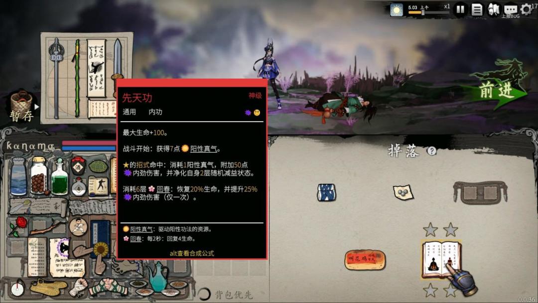 玩家可以在爬塔过程中的开宝箱、战斗、商店获得各种武功秘籍或者装备道具,并将其放入自己的背包中,这些武功秘籍招数体型有大有小,有时需要调整、翻转一下才能放进背包中,还有一些关联性的武学还可以进行合成,会形成新的武学。