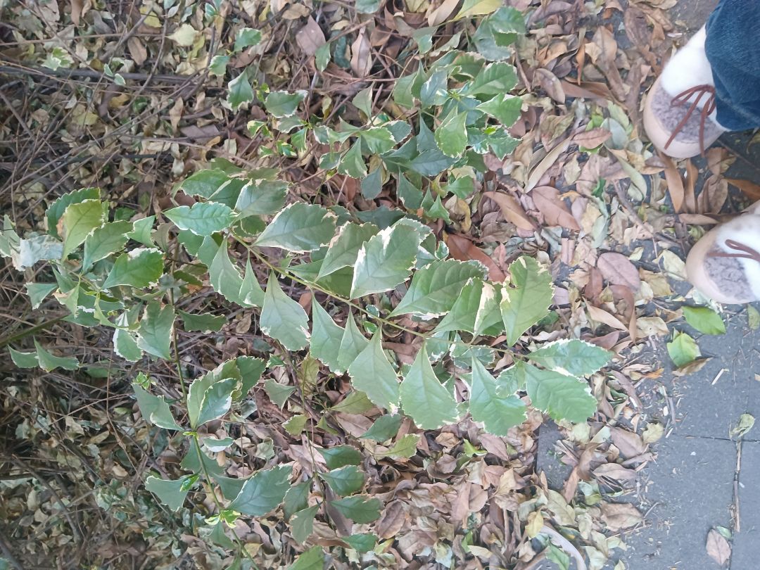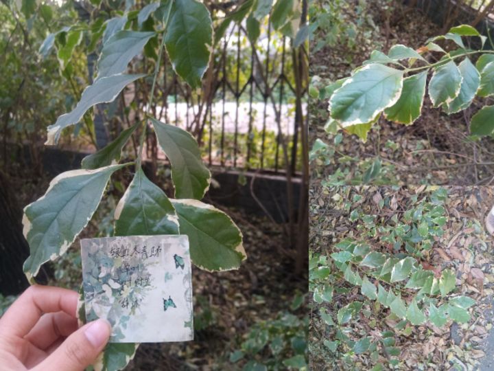 叶片特征:单叶对生,革质有光泽,呈倒卵形或椭圆形,边缘有浅细钝齿,最显著的特征是叶片边缘带有银白色的镶边,与图中形态完全吻合。