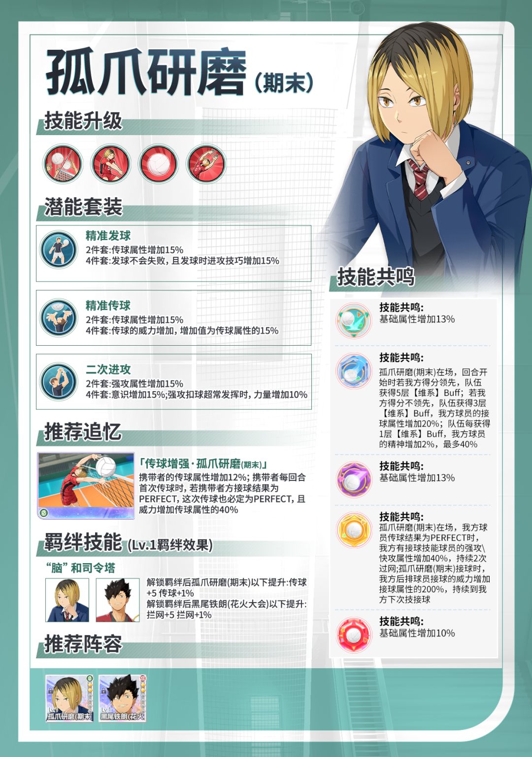 ✍🏻 下面带你一张图了解「孤爪研磨-期末(S)」适合的潜能套装、适配的追忆、技能共鸣介绍、角色独特羁绊、优质阵容组合!