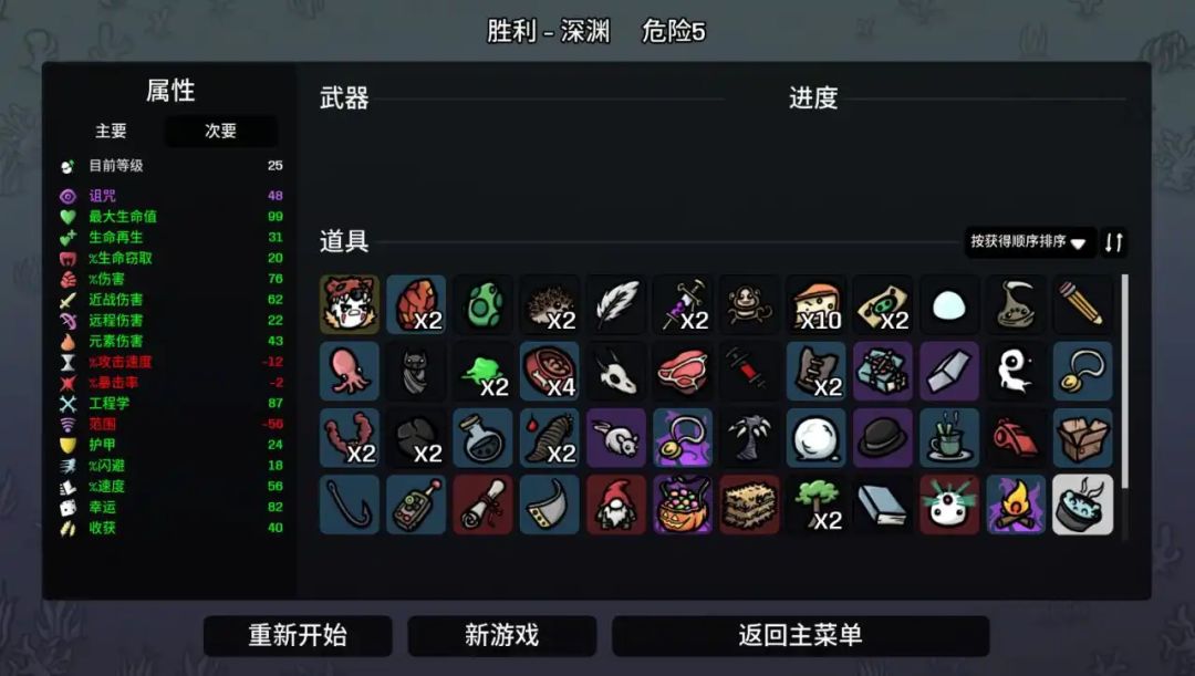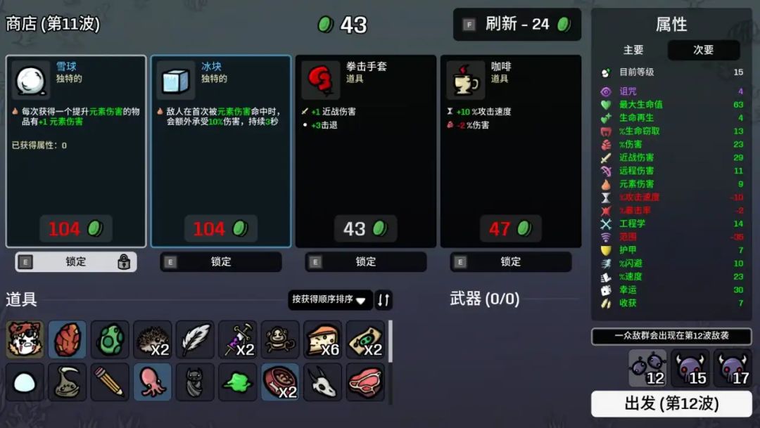 因为宠物输出的随机性,有时候不可避免会吃到一些伤害,再加上boss战需要活过一整个回合,生存属性需要着重加。生存属性主要加生命上限,生命再生和汲取还有防御,前期闪避性价比不佳不着重考虑。由于宠物的输出也吃生命汲取,要是宠物多可以在生命汲取上多倾斜点资源,其他什么萌萌猴,柠檬汁,漏斗也都是不错的续航道具。由于第12波而且没有第二个火蜥蜴,我加了不少血上限,防御和生命汲取确保续航。不少人犯的一大错误就是过多点输出属性伤害严重溢出,这样既对清怪没有帮助也容易因为宠物输出不可控和生存属性的缺失而暴毙,我刚开始就是猛点输出然后被某个漏出来的泥头车冲死。