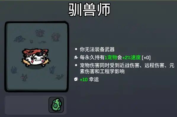 先看特性,无法装备武器导致他防身能力比较差,有时候怪贴脸上了宠物还在打远处的怪,非常高血压。1宠物+2%速度很强,可以不用花钱买移速道具省钱,前期多买几只哈基鼠就可以随便遛怪了。宠物伤害受多种数值影响也让刺猬等+多种伤害属性的道具有了发挥空间。+10幸运属于凑数的,多少能缓解点生存压力吧。然后说说打法思路。由于宠物攻击目标不可控,在打boss这方面就有先天不利。因此我们的加点倾向于优先点生存属性确保存活,伤害属性只需要足够清怪,不会出现回合结束一大堆怪聚在自己后面浪费材料即可。