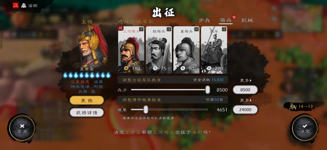 有钱了,封皇埔嵩为武卫将军,带兵八千五加三点武力。宝物七星宝刀给他带上。有此强兵,我都不知道怎么输。