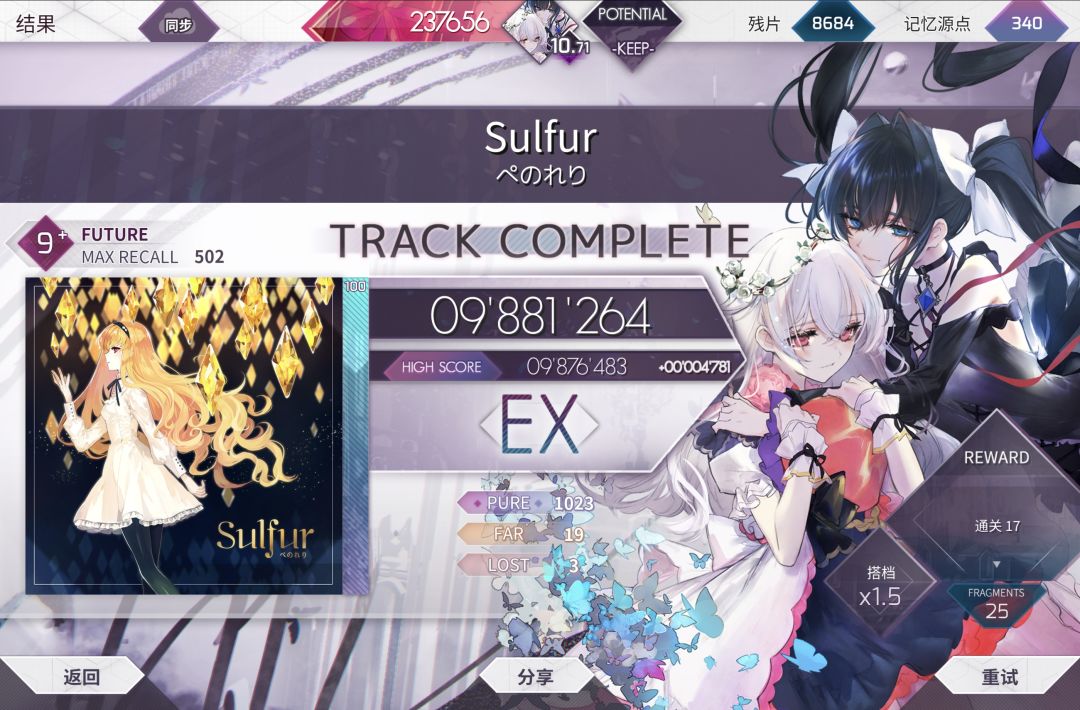 感觉9+的节奏有些难找(尤其是Sulfur的休息段和BLRINK的尾杀),The Message和天堂门基本上是熟练度问题了,有时候手序乱了