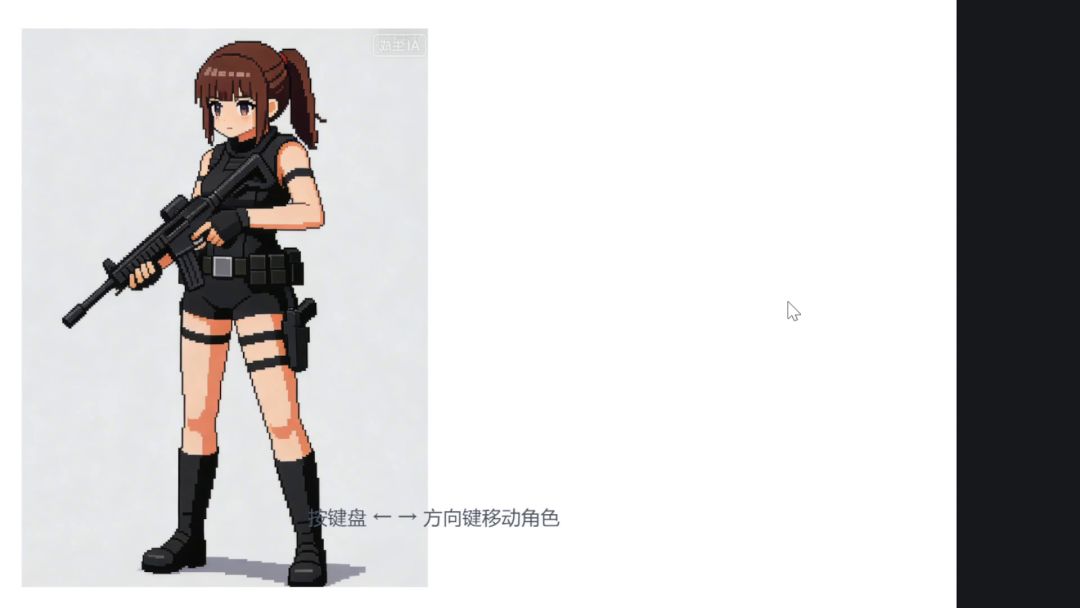 为XX增加键盘方向键控制。按左键时角色向左移动,同时播放‘走路’动画帧;按右键时向右移动并播放‘走路’动画帧;松开按键时停止移动,切换回‘待机’动画帧,移动时角色坐标变化速度为每帧5像素,设定按左键时图片水平翻转(面向左),右键时正常(面向右)”