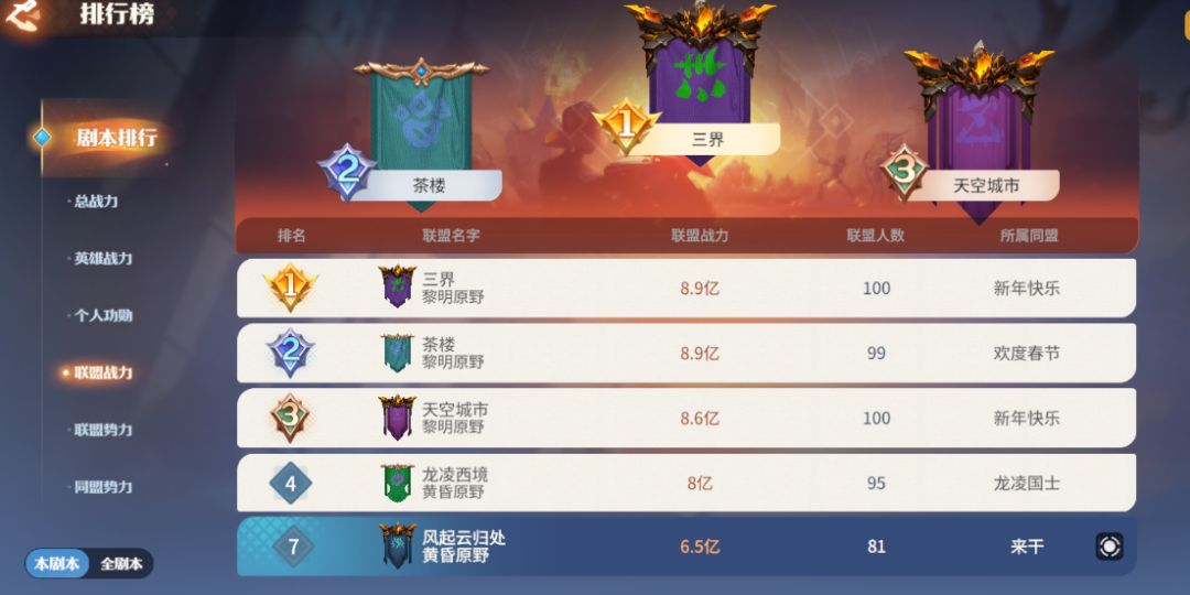 南阵营的【风起云归处】与【酒馆】联手对抗北阵营核心【茶楼】,双方在关键资源区反复拉锯,战况激烈;【三界】与【龙凌西境】正面碰撞,两支劲旅互不相让,战线推进缓慢,胜负难分。