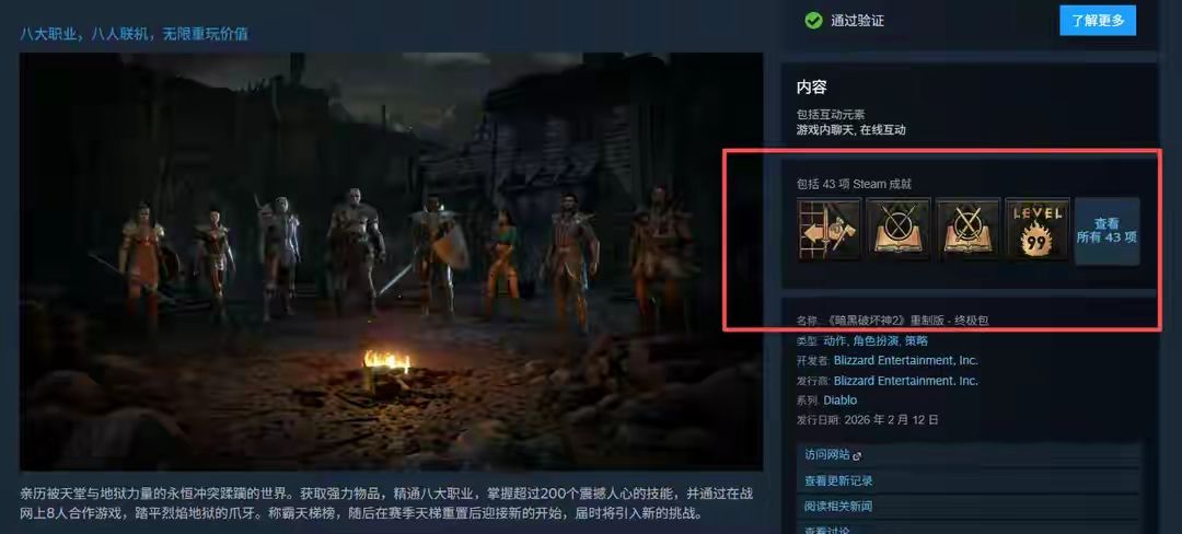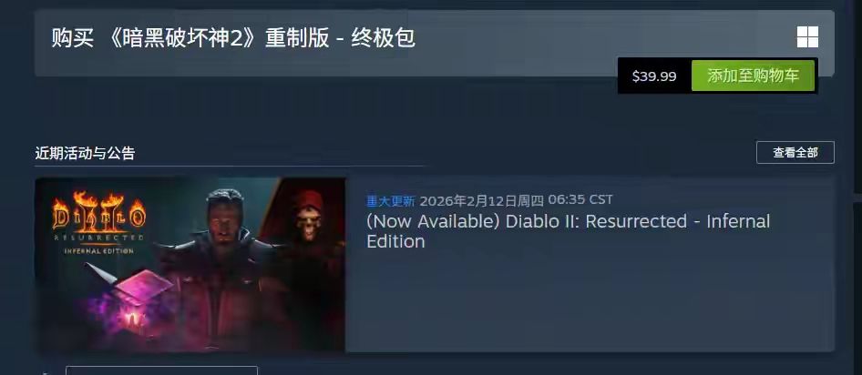 《暗黑破坏神2重制版》新资料片“术士君临”于2月12日官宣并上架,暴雪同期发布了游戏 STEAM版,可惜目前是锁区的,并没有国区,也没有简体中文(有繁体中文)