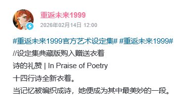 大的出现啦家人们!广州深蓝互动网络科技有限公司开发的策略卡牌类游戏《重返未来:1999》最近官宣了十四行诗的全新皮肤「诗的礼赞」