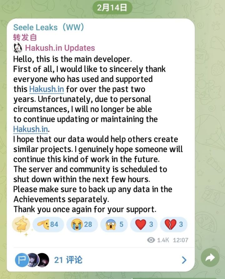 那就是圈内著名的解包数据(内鬼)网站hakush正式宣布关闭。站长亲自发文说因为个人原因没法继续更新维护了,服务器几小时内就要关掉,让大伙有需要备份数据的赶紧动手。这消息一出,玩家圈直接热议。