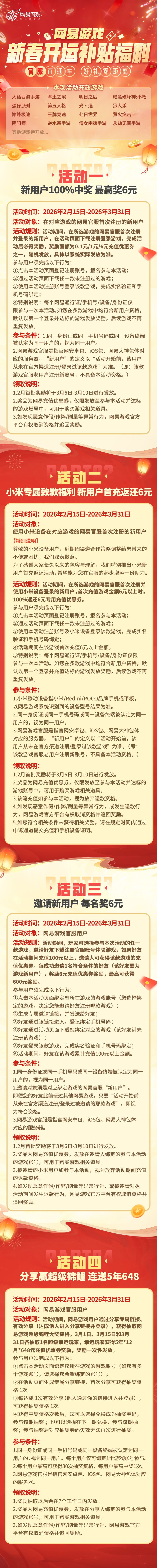 2月15日到3月31日,网易游戏新春开运补贴福利活动正式上线,四重福利排排坐,新老朋友都能上车!点击文末阅读原文前往参与活动或复制链接前往浏览器打开【