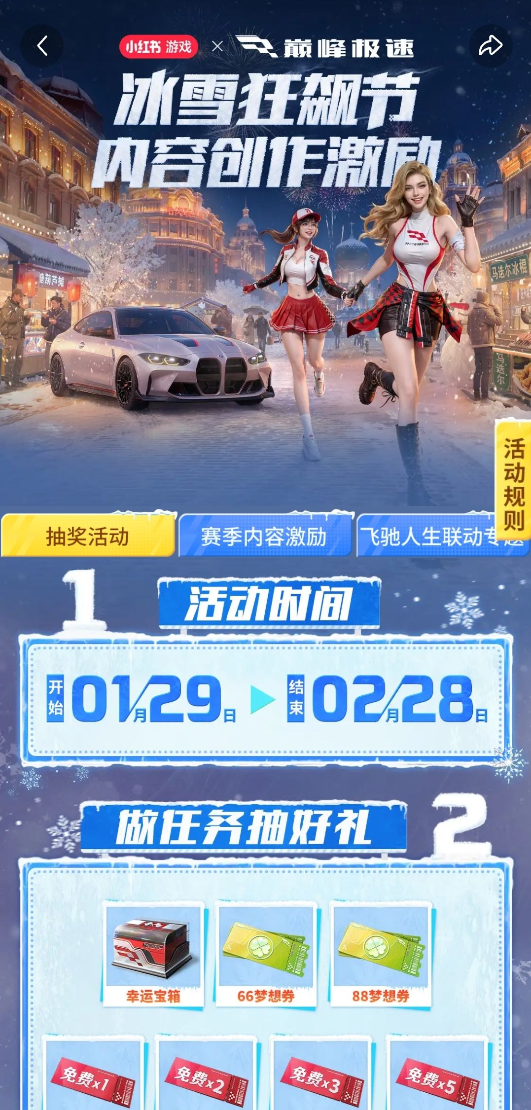 如果车手们平时更习惯刷小红书,那这儿的零花钱更好捡——图文、短视频、九宫格随手拍,全都能换钱!1月29日到2月28日,带话题 #巅峰极速 #巅峰冰雪狂飙节 #抓马巅峰年 投稿新赛季相关内容,8万元现金奖池开放瓜分;2月5日到2月28日,带 #巅峰极速飞驰人生3联动 #上巅当飞驰主角 发联动相关图文或视频,7万元现金奖池单独开放。