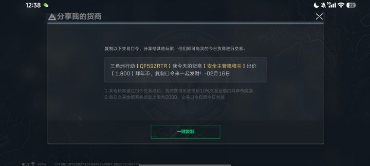 三角洲行动【QF59ZRTR】我今天的货商【安全主管德穆兰】出价【1,800】拜年币,复制口令来一起发财!-02月16日