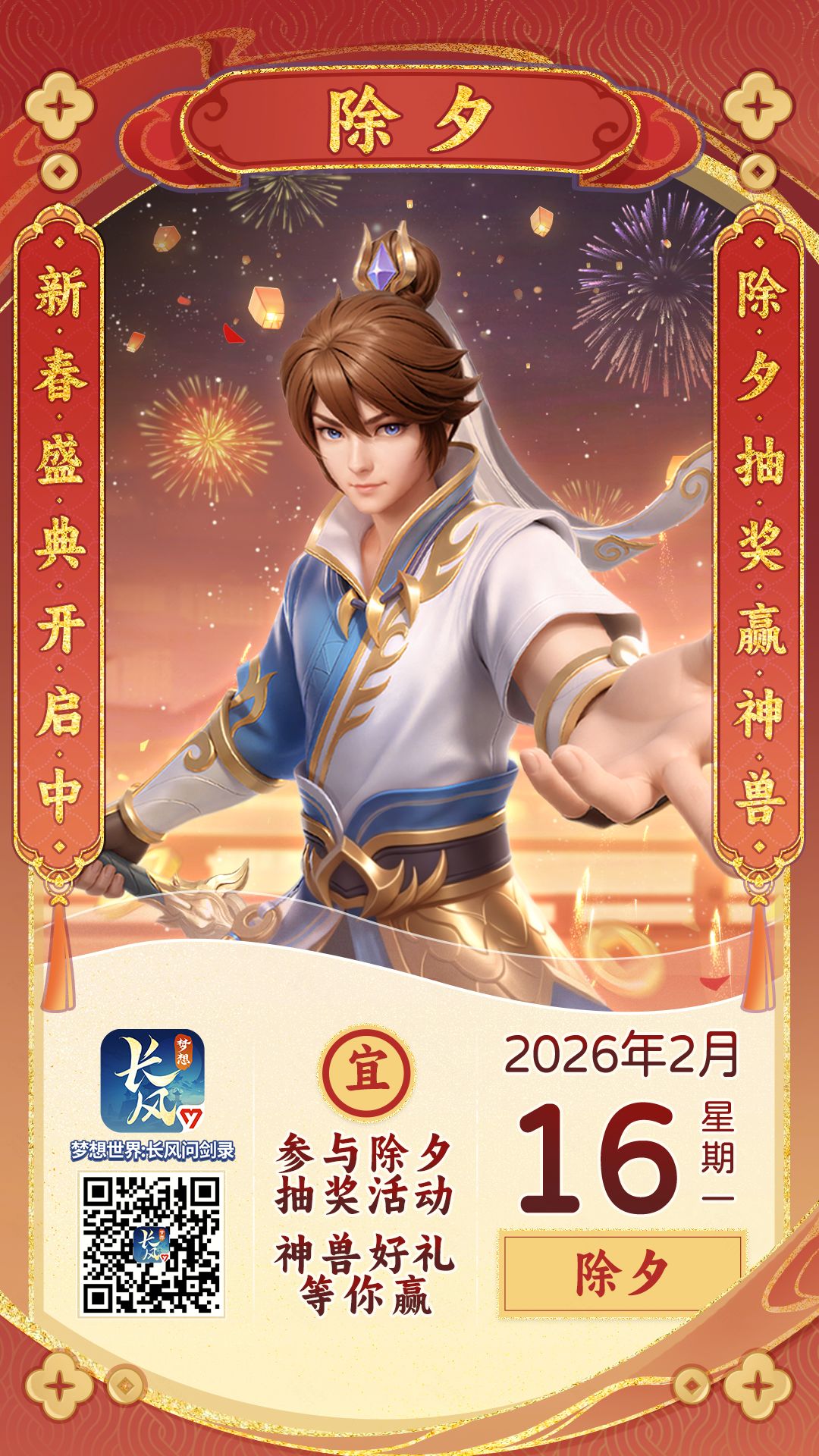 岁末恰逢除夕夜,新春正值好年头!《梦想世界:长风问剑录》在这里祝各位少侠阖家幸福,吉祥安康,除夕快乐!愿各位少侠岁岁年年,平安喜乐!