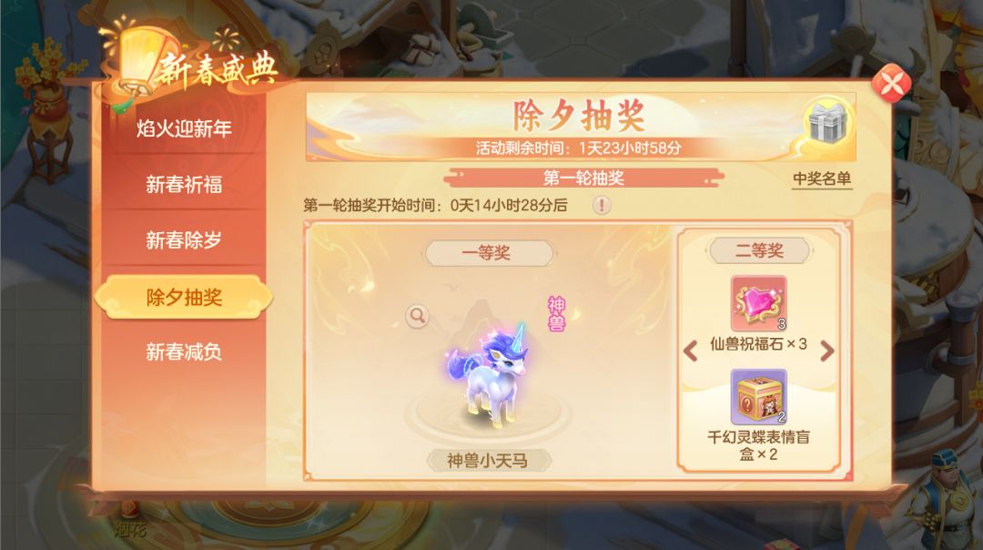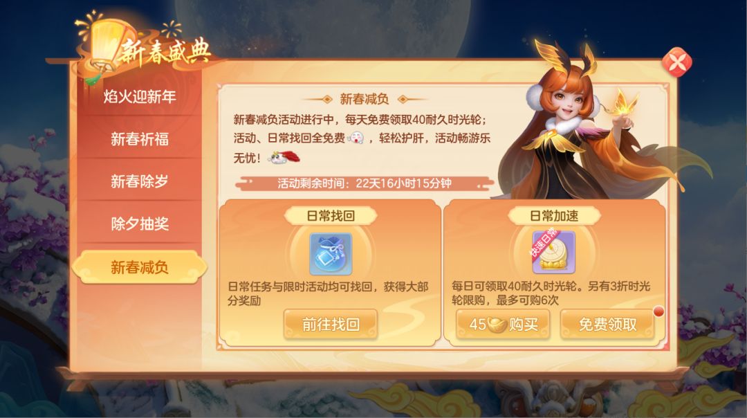 新春减负加码,日常免费找回,假期无忧畅玩!除夕夜免费参与跨年抽奖活动,神兽大奖等你赢;全新坐骑“九天玄鹤”、全新时装“映春锦”上架,新春抽奖赢全新外观与丰富道具好礼!还有新春祈福,新春除岁等年味十足的活动等你来体验!