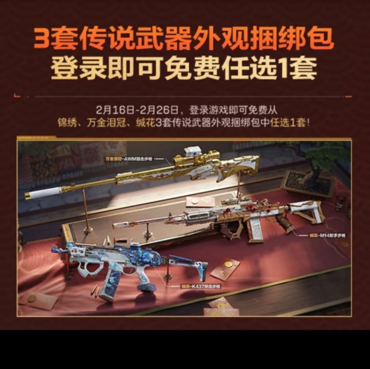 从今天(除夕)起到2月26日(初十),登录即可从三套传说武器外观捆绑包中自选一套!!