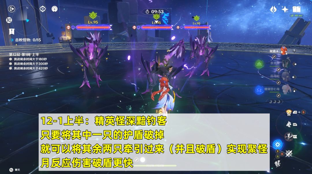 然后是12层,先说上半:第一间是精英怪深黯钓客,一共15只,每3只一组。只要将其中一只的护盾破掉,就可以将其余两只牵引过来(并且破盾)实现聚怪;月反应伤害破盾更快。