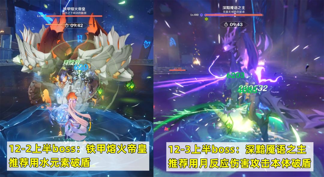 第二间是boss铁甲熔火帝皇,推荐用水元素破盾;第三间是boss深黯魇语之主,和第一间的精英怪机制类似,boss开局就会开盾,此时用月反应伤害攻击本体可以快速破盾,当然还可以通过清理boss召唤出的小怪破盾。