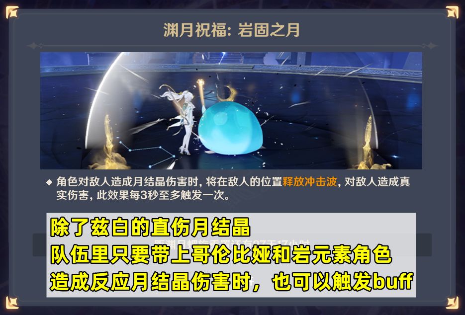 【buff简析】本期渊月祝福buff是造成月结晶伤害时,额外造成范围真伤。除了兹白的直伤月结晶,队伍里只要带上哥伦比娅和岩元素角色,造成反应月结晶伤害时,也是可以触发buff的。