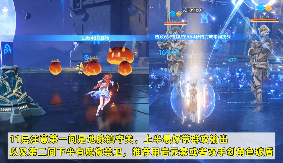 【怪物配置和机制应对】11层依旧以考验练度为主,比较值得注意的是第一间是地脉镇守关,上半最好带群攻输出;以及第二间下半有魔像禁卫,推荐用岩元素或者双手剑角色破盾。