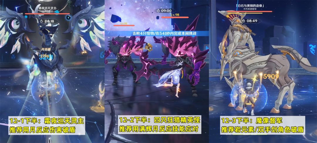 下半第一间是霜夜巡天灵主;第二间是四只狂猎怪;第三间是魔像督军。机制方面因为都在之前的深境螺旋出现过,就不详细展开了,依次分别推荐用月反应伤害、满辉月反应技能以及岩元素/双手剑破盾或者应对。